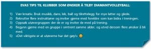 «Det er rett og slett kjempegøy på diamanttrening!», sier Eva og smiler. «Barna ler og koser seg! Jeg gleder meg til å starte opp igjen til høsten». Øfstaas håper at flere barn ønsker å spille diamantvolleyball og har gode tips til oppstart av diamantvolleyball i nye klubber.